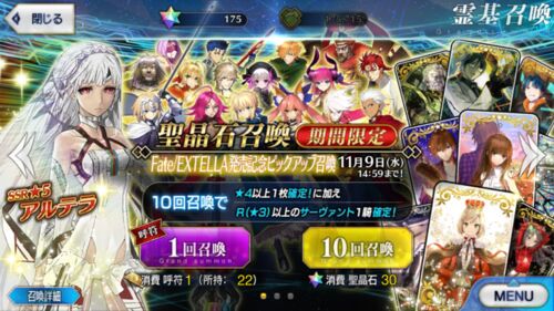 『Fate Grand Order』の2016年11月3日0:00から11月9日14:59までの期間限定聖晶石召喚「Fate/EXTELLA 発売記念ピックアップ召喚」を30連してきました。